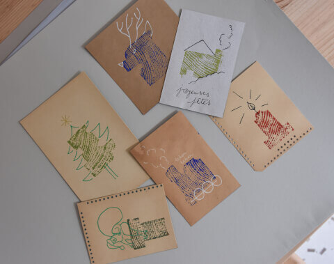 Venez exercer votre imaginaire et réaliser des cartes de vœux à partir d’empreintes de bois ! Nous vous proposons d’explorer avec nous le vocabulaire graphique propre aux pièces de menuiserie traditionnelle, d’extraire et réinterpréter les formes des montants de fenêtres. Vous composerez une série de dessins, d’images autour de sections de cadres de fenêtres, dont vous viendrez faire l’empreinte comme des tampons. Avec des encres de linogravure associées à des feutres ou crayons, sur du papier de réemploi de différente nature, vous pourrez faire varier les styles graphiques et les associations colorées. Vous obtiendrez des tirages uniques –entre 1 et 5 selon le(s) format(s) choisi(s)–, pour habiller un porte-carte ou un petit cadre, ou tout simplement pour envoyer une pensée à vos proches par la poste. Cet atelier fait partie de la thématique « Empreintes & Rythmes » qui explore les multiples possibilités de compositions graphiques, de motifs et de rythmes extraites des formes du bois de fenêtres réemployées. Il s’adresse à tous les créatifs et toutes les créatives minutieux.ses. Il est tous publics à partir de 7 ans.